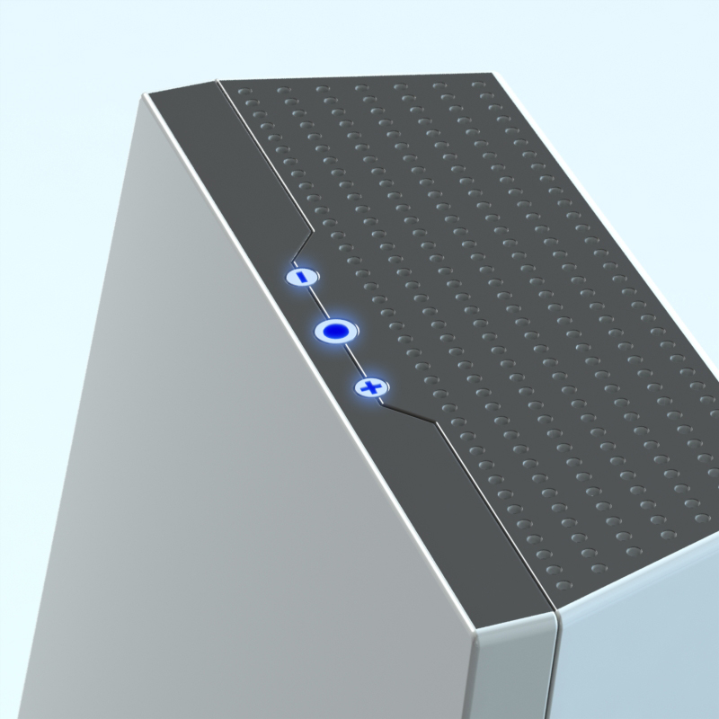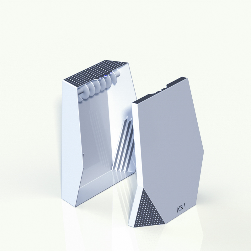 Der AIR 1 ist ein Luftreiniger, der die Luft in der Umgebung einsaugt und gereinigt wieder abgibt. Dies wird durch Filter gewährleistet, die in dem Gehäuse untergebracht sind. Das Design orientiert sich an Kristallen, da Kristalle im Allgemeinen für Reinheit stehen. Die perforierten Flächen, die das Innere des Gerätes freigeben, zeigen ein fein strukturiertes Innenleben. Die Gehäusefront lässt sich für das Auswechseln der Filter abnehmen.